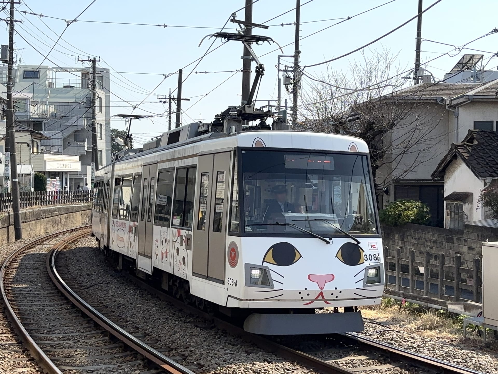 A cat-themed carriage on the Setagaya Line adds a playful touch to the journey through this quiet corner of Tokyo